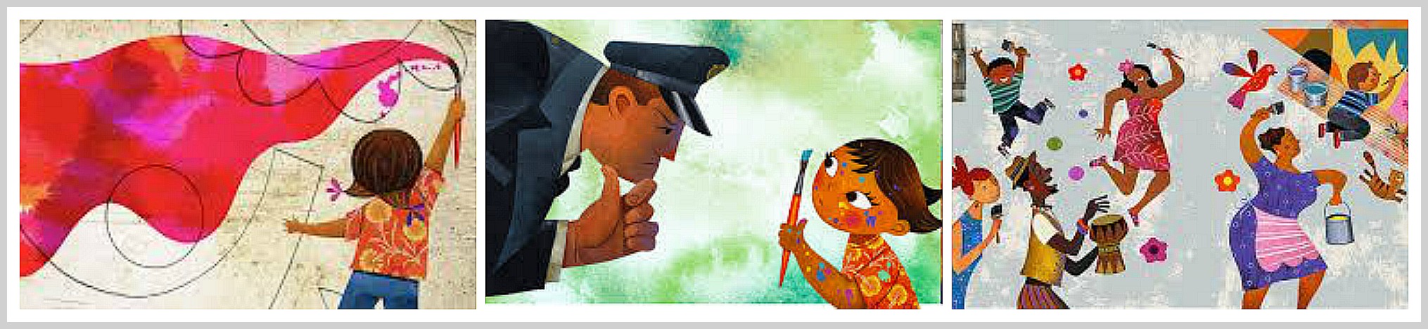 Eventually a muralist takes notice of Mira’s work. Together they start a community project to make the gray walls in their neighbourhood beautiful works of art. Neighbours of all ages, races and walks of life join in, and turn the project into a joyful celebration that brings the community closer together.
